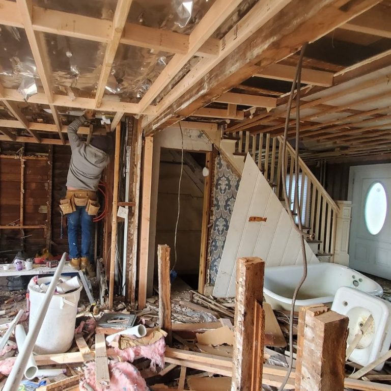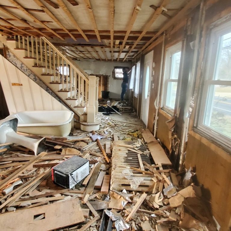 The house was in complete demolition, with exposed framing, debris, and outdated fixtures removed.